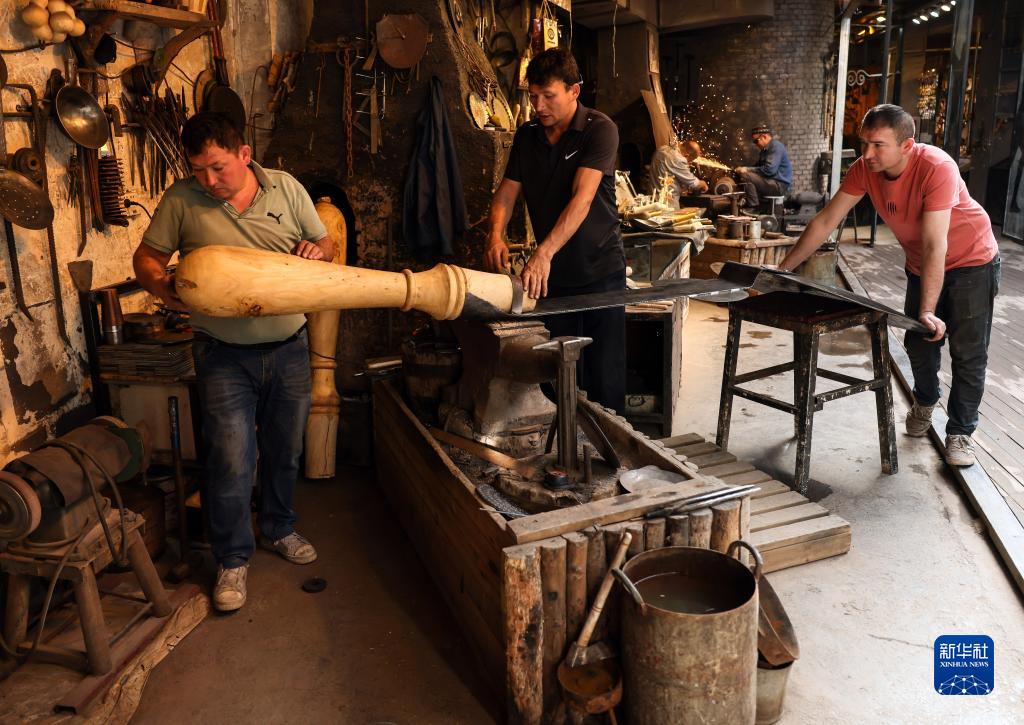 在新疆喀什古城景區鐵業公社內,手藝人在製作鐵器(9月6日攝)。