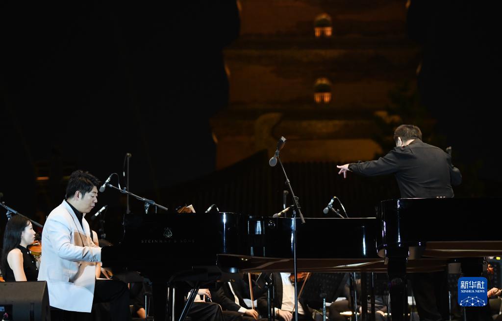 9月10日晚,鋼琴家郎朗(左)、指揮家呂嘉(右)與西安交響樂團在西安大雁塔北廣場戶外公演。
