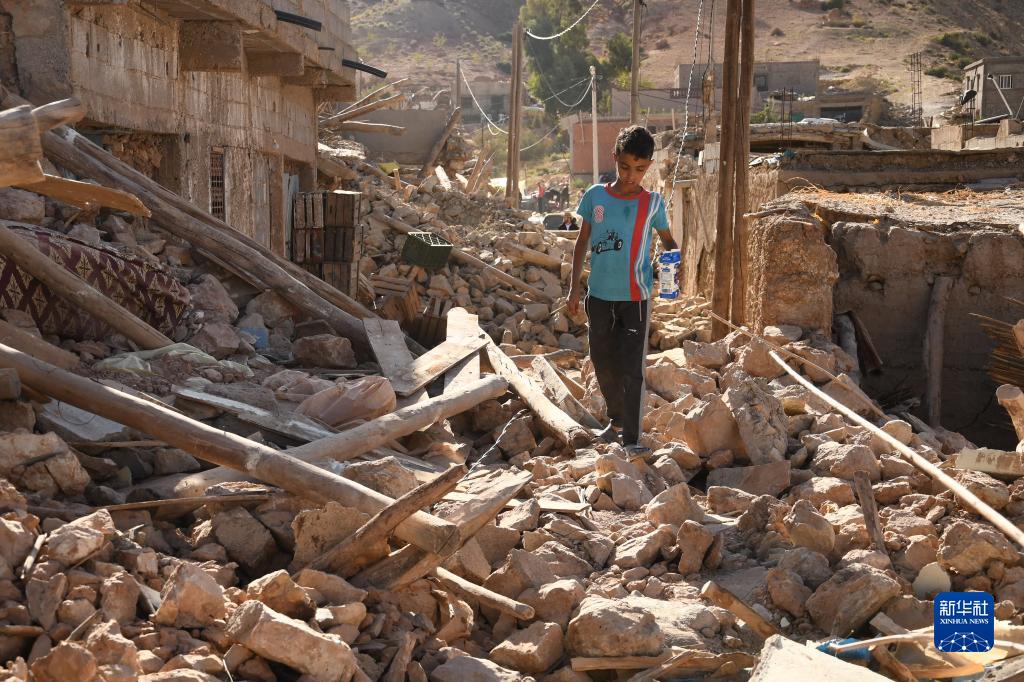 9月10日,在摩洛哥震中附近的艾米茲米茲村,一名男孩從損毀的建築上走過。