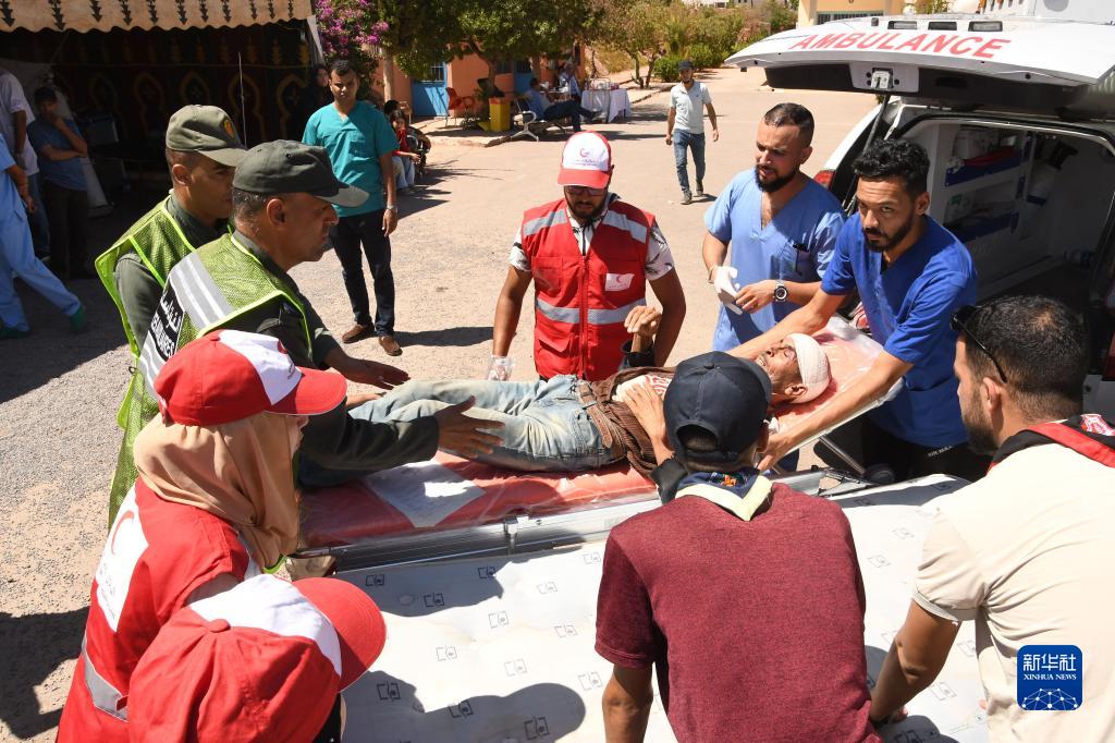 9月10日,在摩洛哥震中附近的艾茲魯村,救援人員將傷者抬上救護車。