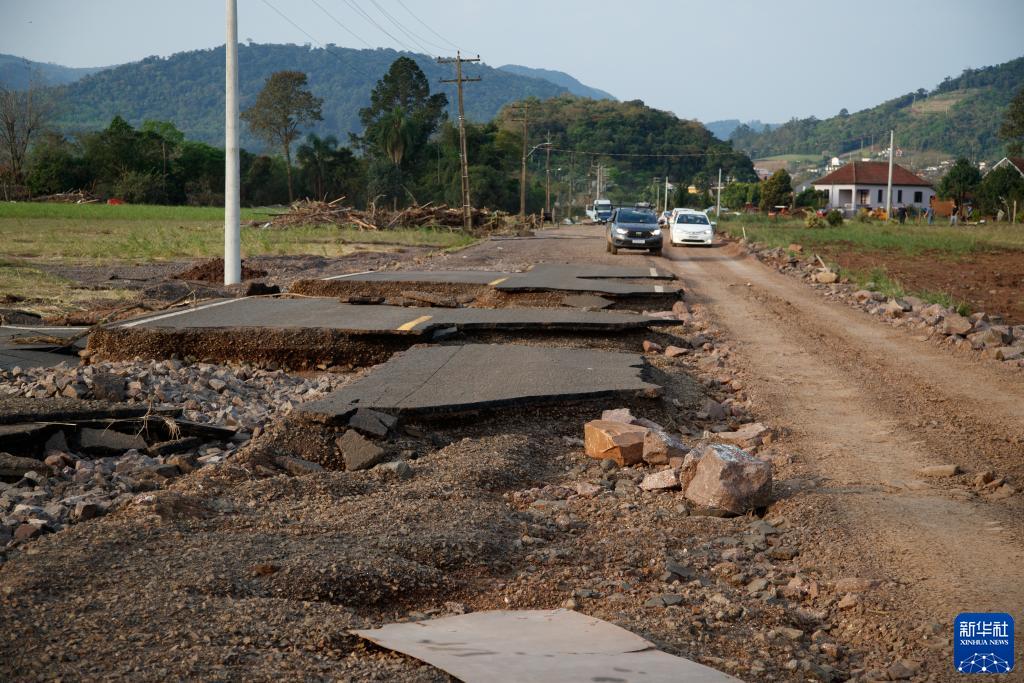 這是9月10日在巴西南裏奧格蘭德州科利納斯市拍攝的被洪水摧毀的道路。