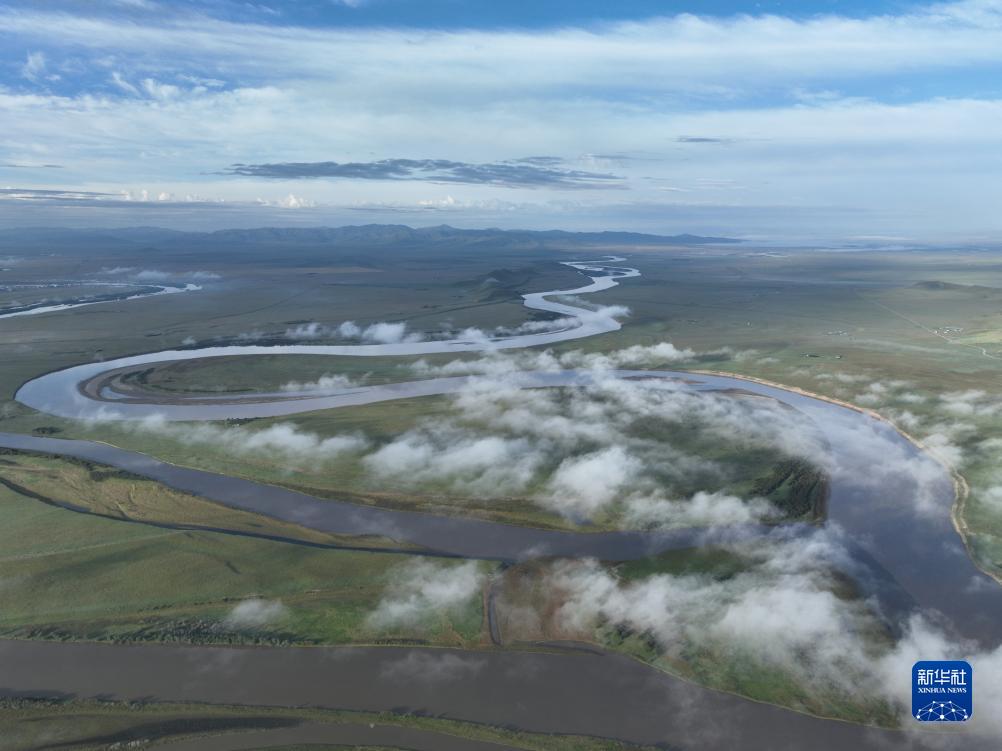 這是8月24日在四川省阿壩藏族羌族自治州若爾蓋縣唐克鎮拍攝的黃河九曲第一灣景色(無人機照片)。