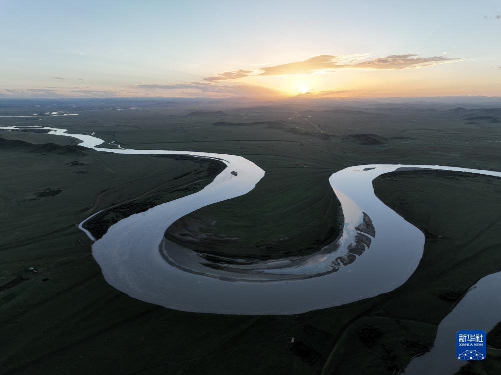 這是8月21日在四川省阿壩藏族羌族自治州若爾蓋縣唐克鎮拍攝的黃河九曲第一灣落日(無人機照片)。