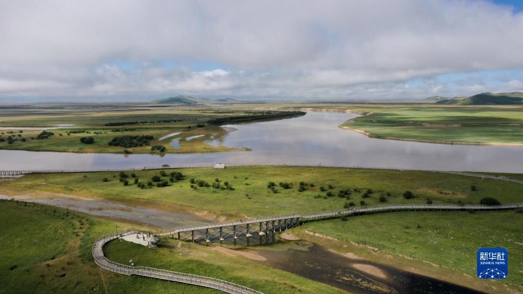 這是8月22日在四川省阿壩藏族羌族自治州若爾蓋縣唐克鎮拍攝的黃河九曲第一灣景色(無人機照片)。