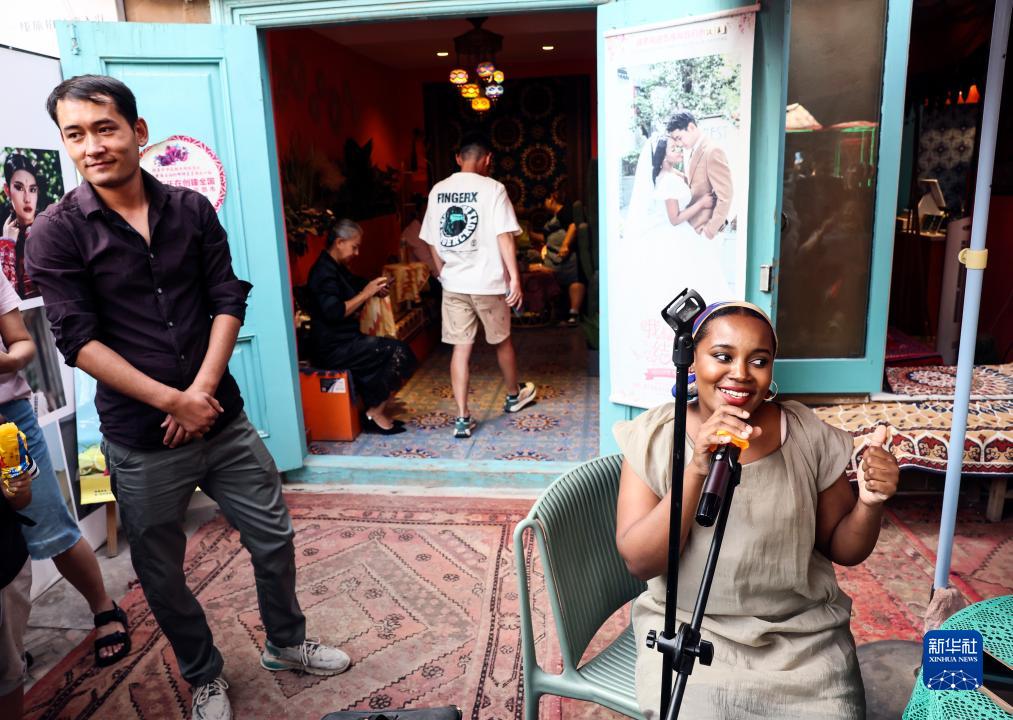 海迪雅在自家咖啡館前唱歌(9月7日攝)。