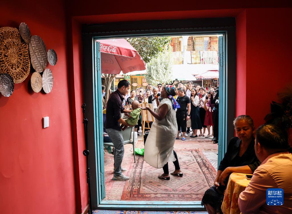 海迪雅(中)在自家咖啡館前唱歌,丈夫迪力夏提抱着孩子與她互動(9月7日攝)。