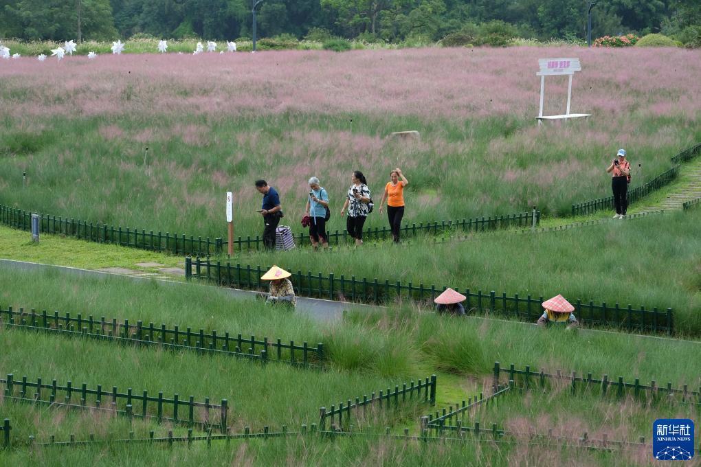 9月11日,游客在廣西南寧市園博園觀賞粉黛亂子草。