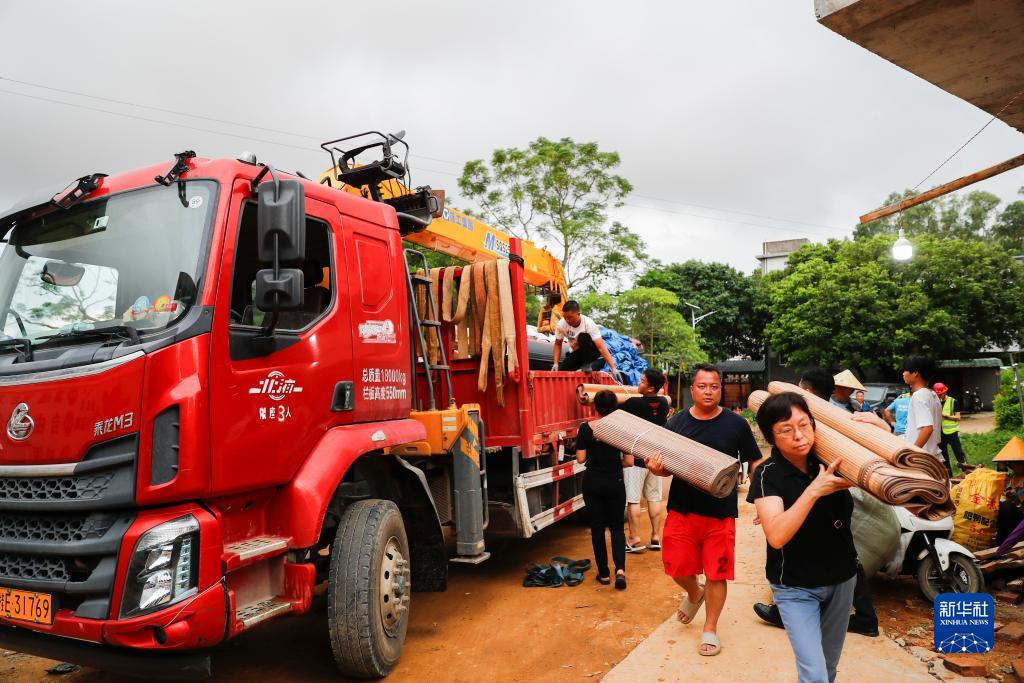 9月11日,在廣西北海市合浦縣白沙鎮虎嶺村,群眾和政府工作人員將被褥、竹蓆等物資搬入安置點。