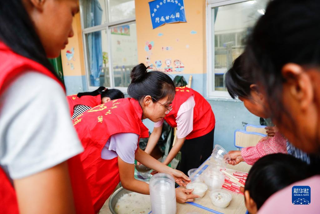 9月11日,在廣西北海市合浦縣白沙鎮虎嶺村,志願者為安置點的群眾分發晚餐。