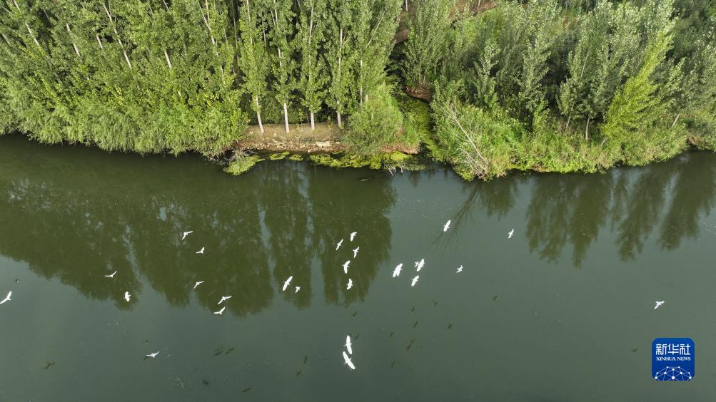 在河北省遵化市,一群白鷺在引灤入津工程重要輸水河道黎河上空飛翔(9月11日攝,無人機照片)。