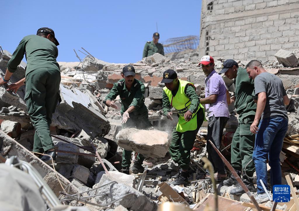 9月11日,救援人員在摩洛哥馬拉喀什南部的艾米茲米茲村地震廢墟上搜救。