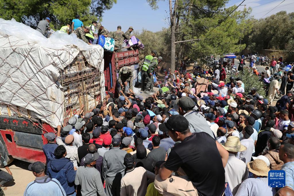 9月11日,救援人員在摩洛哥馬拉喀什南部的艾米茲米茲村分發救災物資。