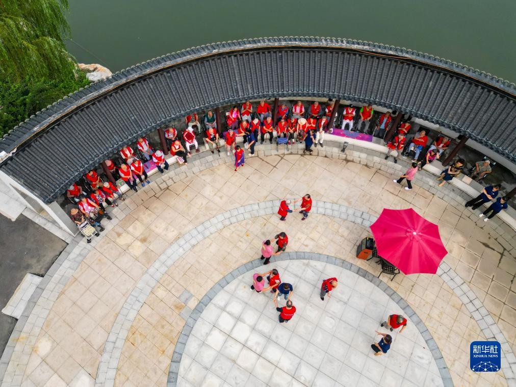 9月12日,河北省唐山市古冶區一家養老機構的老人們在院子裏休閒(無人機照片)。