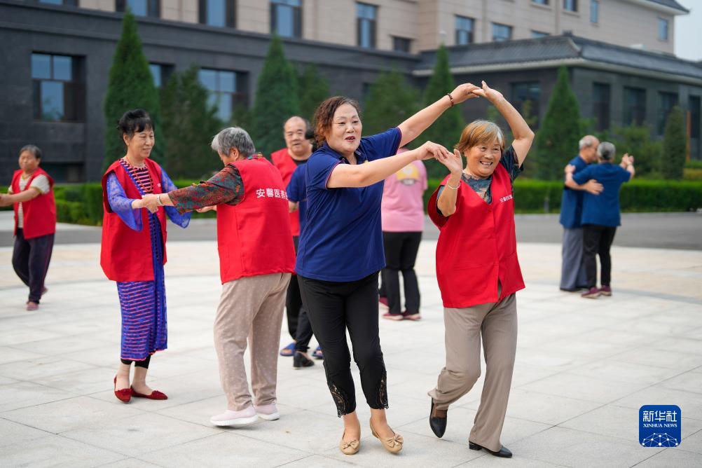 9月12日,河北省唐山市古冶區一家養老機構的老人們在院子裏運動。