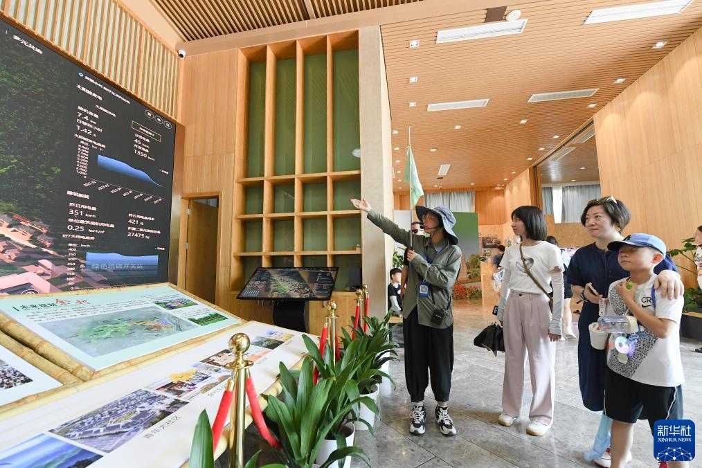 游客在浙江省湖州市安吉縣余村未來鄉村展館了解當地綠色用能情況(2023年8月11日攝)。 2023年8月初,浙江省湖州市安吉縣余村成功進行了首次“綠電綠證”交易,購買來自寧夏、黑龍江、安徽等地的光伏和風力電621.2萬千瓦時,購買“綠證”2878張,相當於減排二氧化碳2869噸,實現了全域“綠電”供應,標誌着余村向建設“零碳鄉村”邁出重要一步。