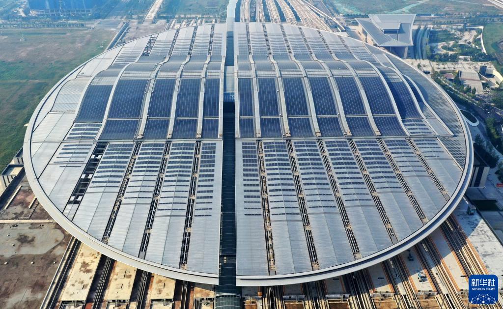 京雄城際鐵路雄安站站頂分佈式光伏電站(2022年9月9日攝,無人機照片)。