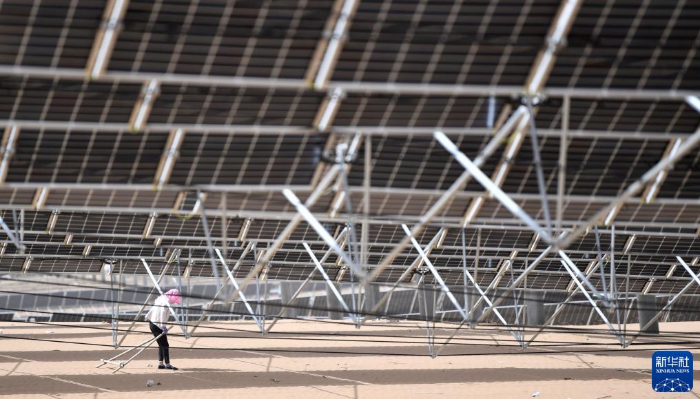 在甘肅省武威市涼州區九墩灘光伏治沙示範園區,工人在光伏板下作業(2023年5月19日攝)。