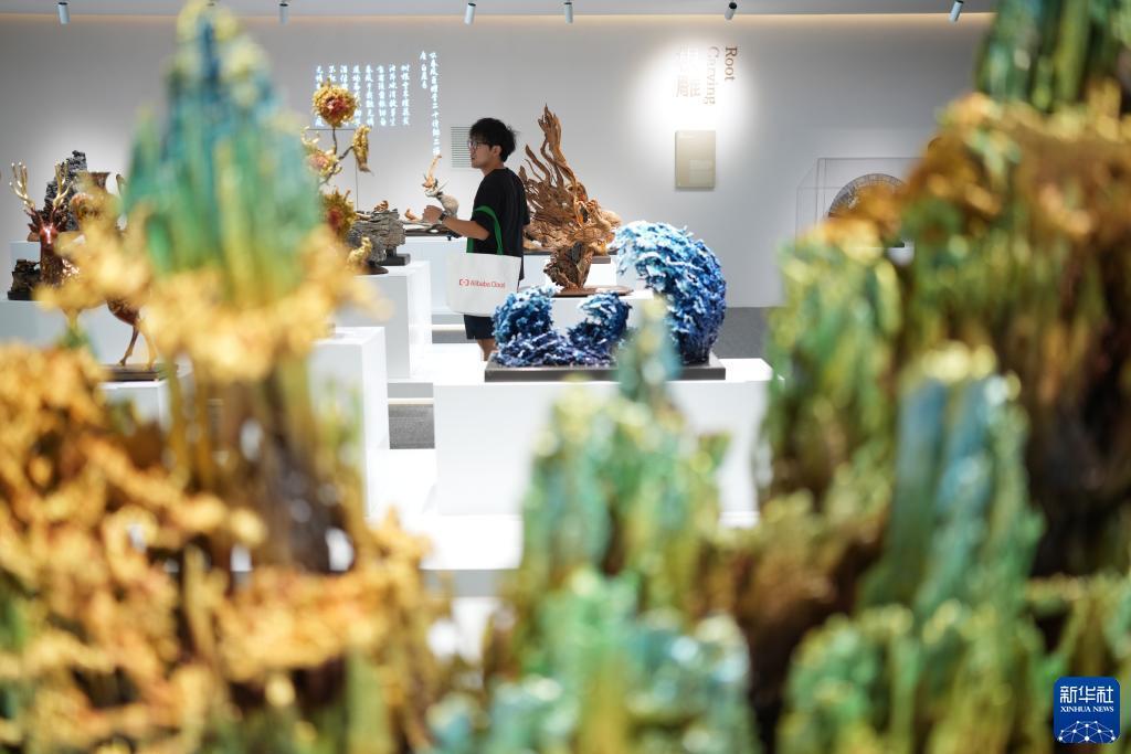 9月12日,媒體記者參觀亞運村內展示的銅雕、根雕作品。