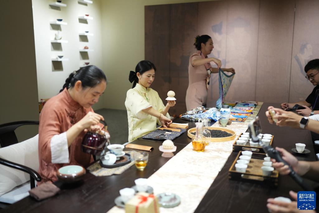 9月12日,工作人員在亞運村內展示茶藝、茶點、絲綢。
