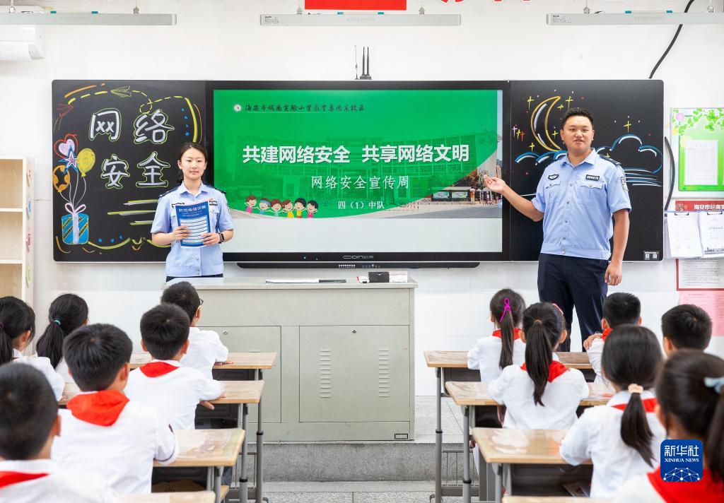 9月11日,在江蘇省海安經濟開發區實驗小學,海安市公安局城東派出所民警在給小學生普及網絡安全知識。