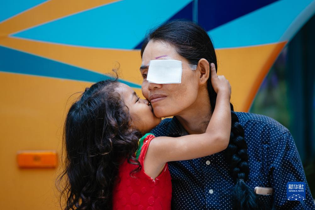 這是2019年3月15日,在柬埔寨磅湛省醫院,即將接受白內障手術的患者孫美樂接受女兒的親吻祝福。孫美樂是柬埔寨一名貧困的單身母親,左眼患上白內障幾近失明。在接受了中國醫療隊的白內障義診手術後,她的視力逐步恢復,生活有了新的光明和希望。