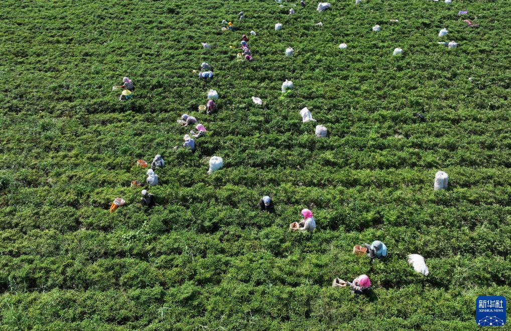 9月12日,唐山市豐南區東田莊鄉大吳莊戶村的農民在田間采收辣椒(無人機照片)。