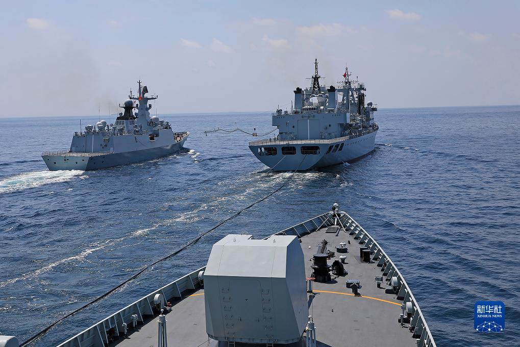 中國海軍第45批護航編隊在任務準備期間組織航行補給訓練(8月24日攝)。