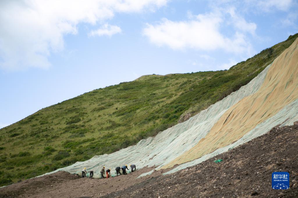 在若爾蓋縣達扎寺鎮多瑪村廢棄礦山治理點,工人在邊坡上鋪椰絲毯(8月23日攝)。