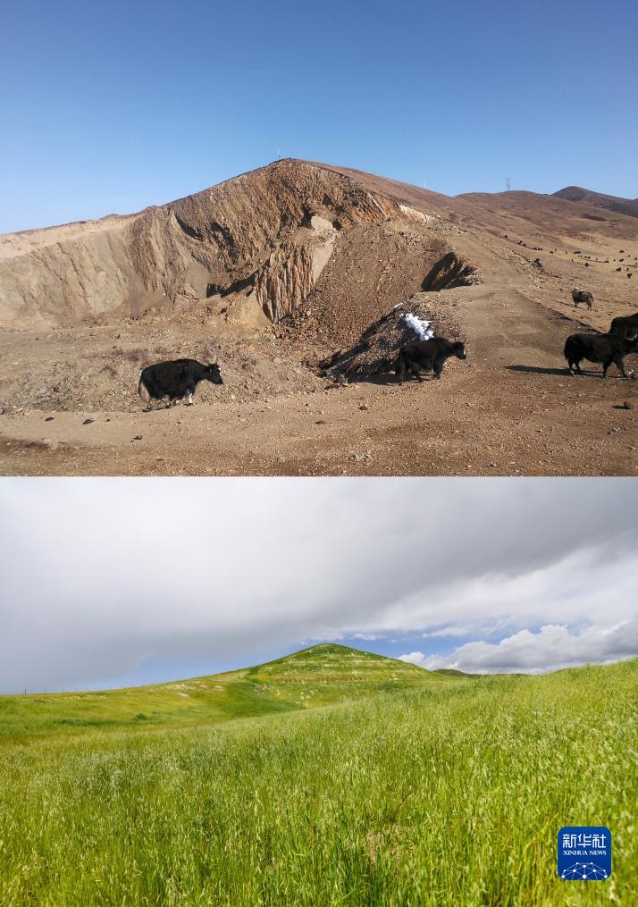 拼版照片:上圖為若爾蓋縣唐克鎮嘎爾瑪村治理前的坡面(3月8日攝,若爾蓋縣自然資源局供圖),下圖為嘎爾瑪村治理後的坡面(新華社記者王曦8月23日攝)。