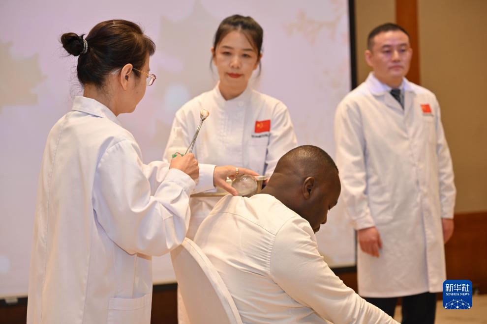 9月11日,在科威特大穆巴拉克省,中國(吉林)第15批援科威特醫療隊隊員在紀念儀式現場展示中醫拔罐。