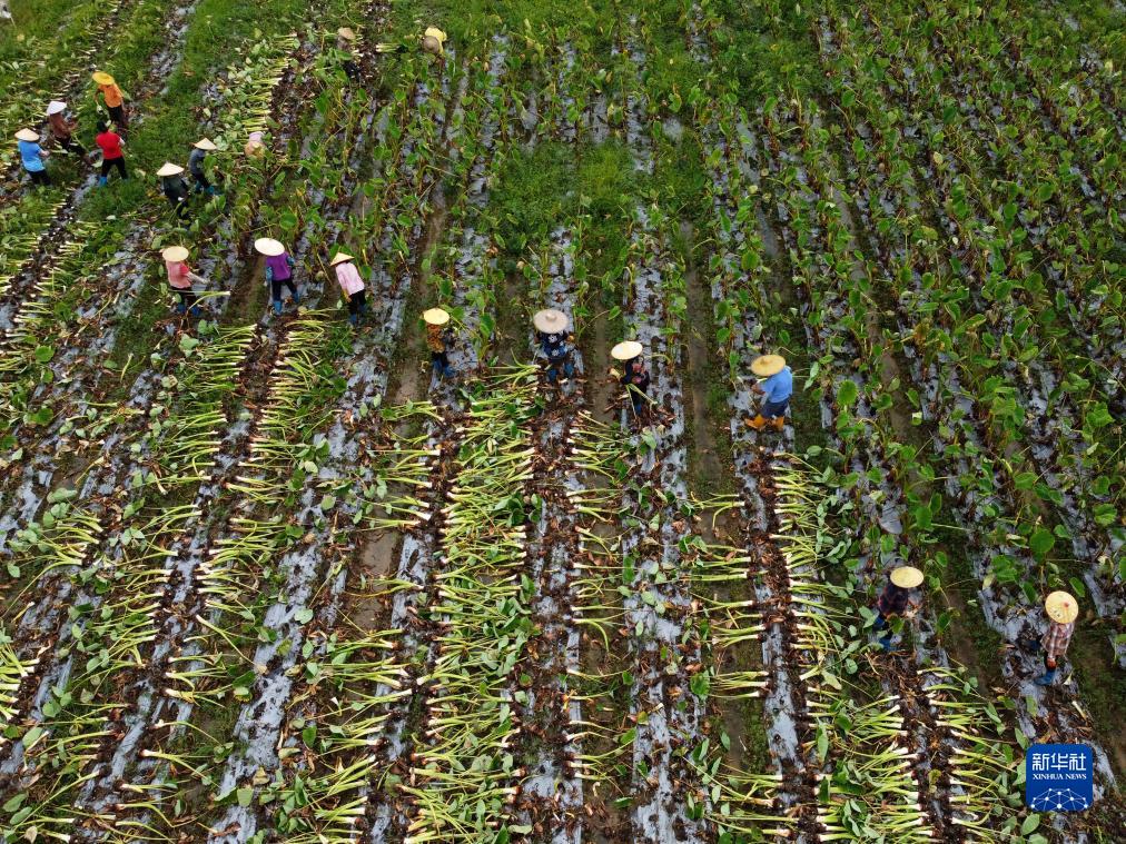 9月11日,在賀州市八步區蓮塘鎮炭衝村馬鞍寨香芋種植基地,村民在採挖香芋(無人機照片)。