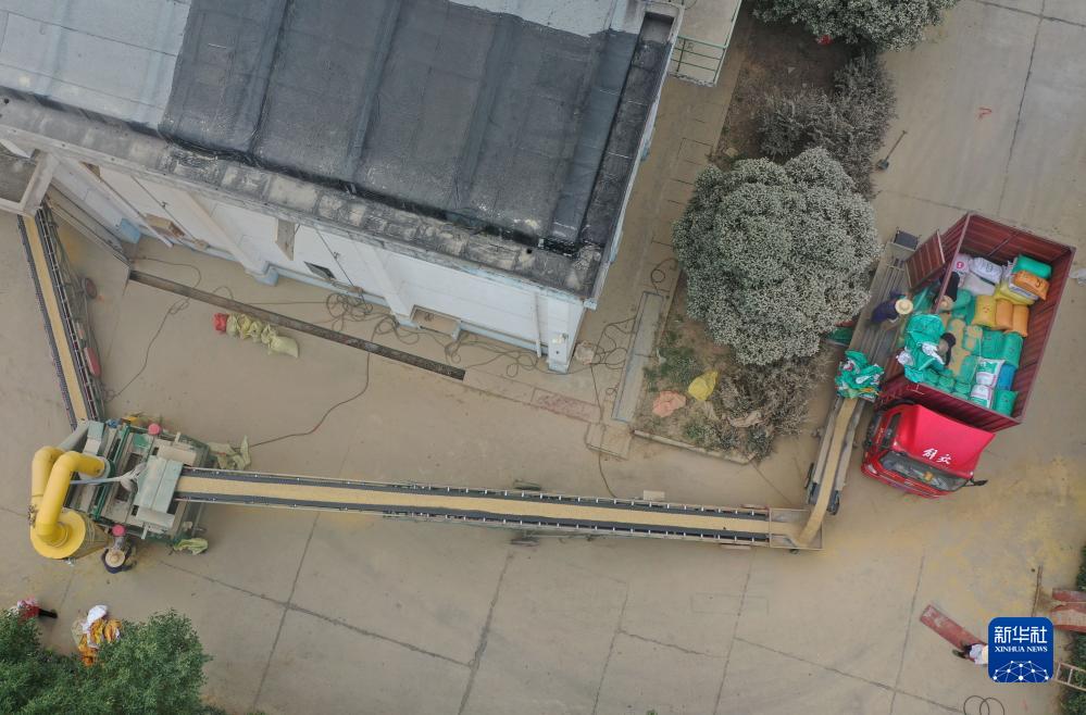 9月12日,在湖南省衡南縣三塘鎮,衡陽一家糧食收儲企業的工作人員在卸糧入庫(無人機照片)。
