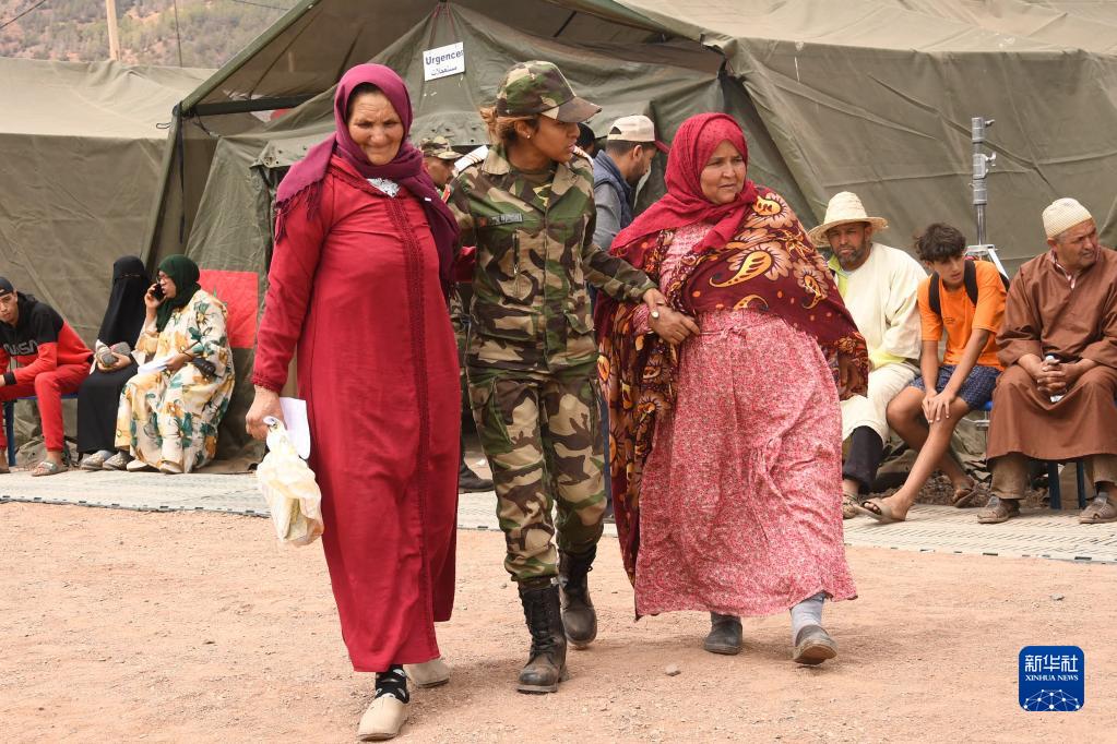 9月12日,救援人員在位於摩洛哥豪茲省艾斯尼村的臨時軍事醫院引導災民。
