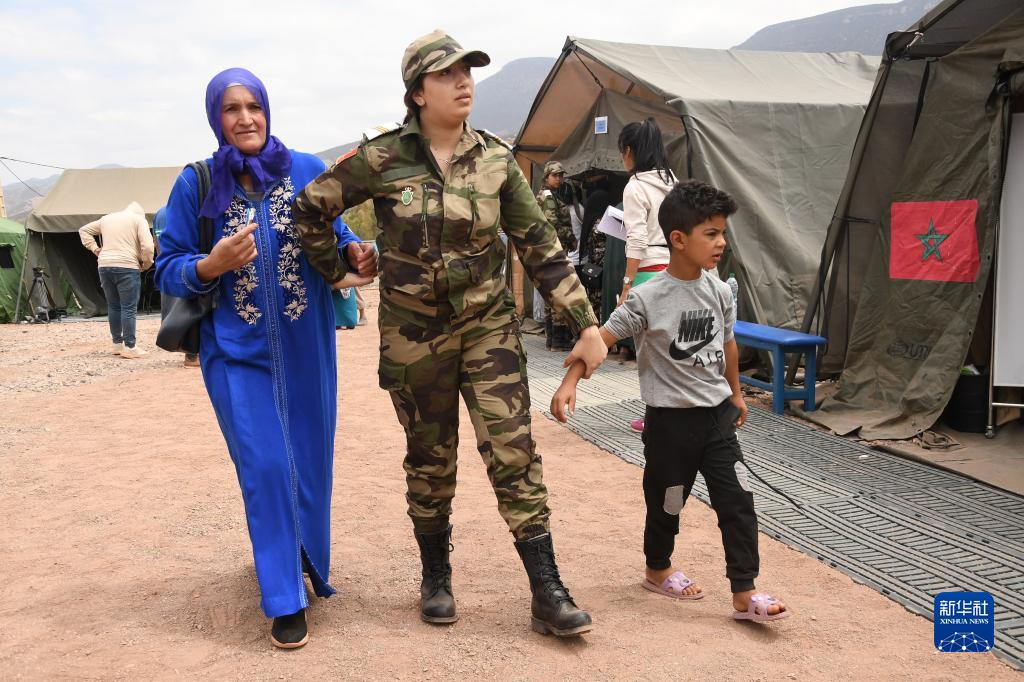 9月12日,救援人員在位於摩洛哥豪茲省艾斯尼村的臨時軍事醫院引導災民。