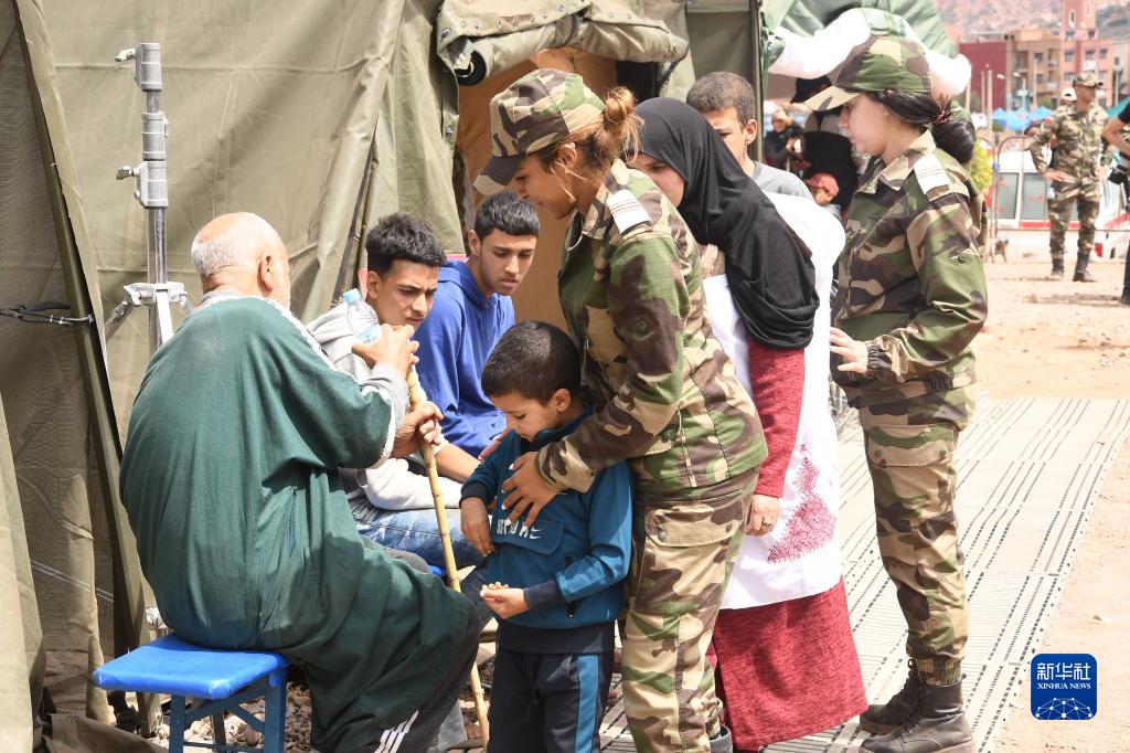 9月12日,救援人員在位於摩洛哥豪茲省艾斯尼村的臨時軍事醫院引導災民。