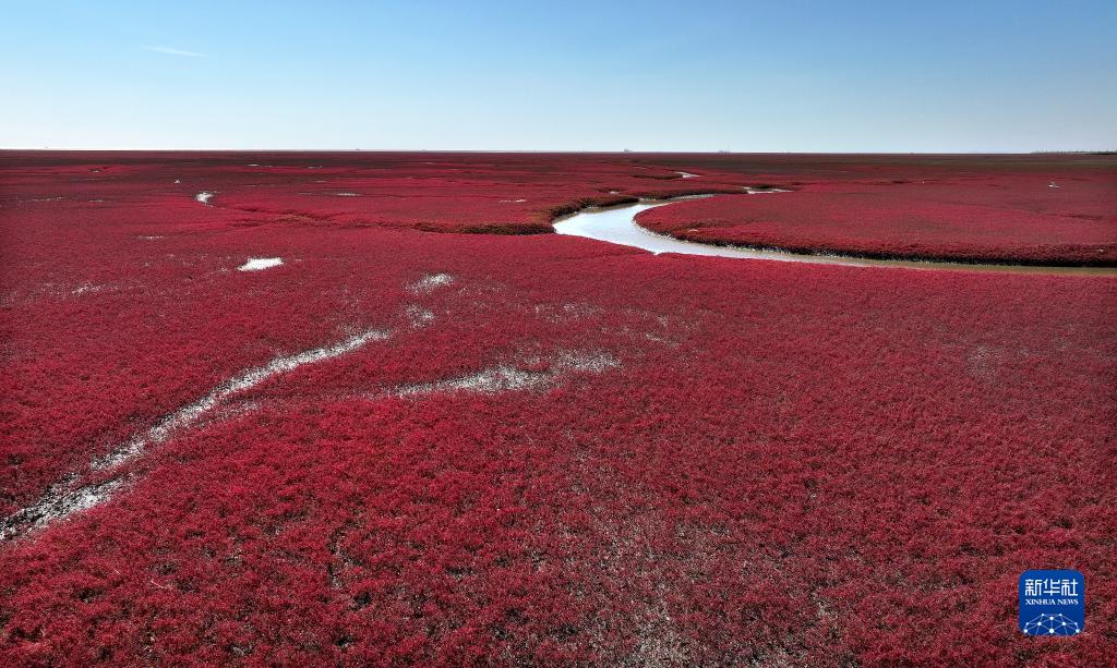 盤錦紅海灘國家風景廊道景區內的紅海灘(9月12日攝,無人機照片)。
