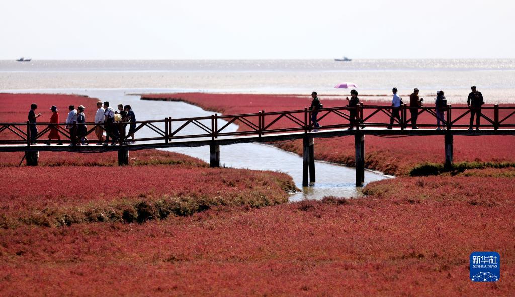 近日,遼寧省盤錦紅海灘國家風景廊道內的鹼蓬草迎來最佳觀賞期,吸引了眾多游客前來觀賞游玩。