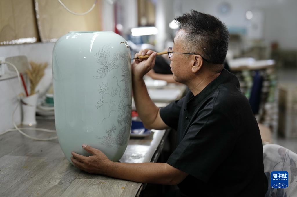 9月12日,戴佩維在進行陶瓷雕金創作。