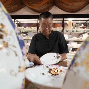 河北省唐山市素有“北方瓷都”的美譽,陶瓷雕金技藝作為陶瓷裝飾技法之一,在當地歷史悠久。唐山市路北區居民戴佩維17歲時進入陶瓷廠學習雕金技藝,經過45年的潛心研究,將傳統技藝與美術繪畫、印刷技術、現代裝飾風格相結合,在普通細白瓷、骨質瓷等眾多瓷種上實現雕金裝飾的藝術創作,使雕金技法更加豐富多彩。2022年,以戴佩維為代表性傳承人的傳統陶瓷雕金技藝被列入唐山市市級非物質文化遺産代表性項目名錄。