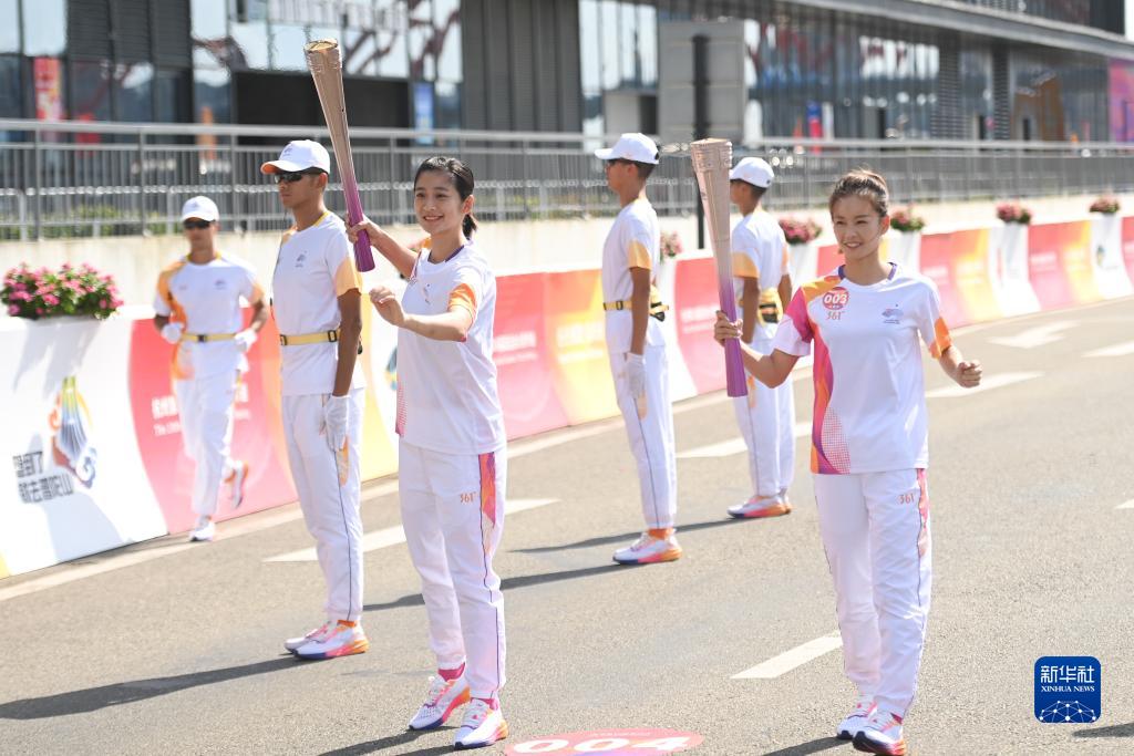 9月13日,火炬手楊家玉(右)與王琳在火炬傳遞中。