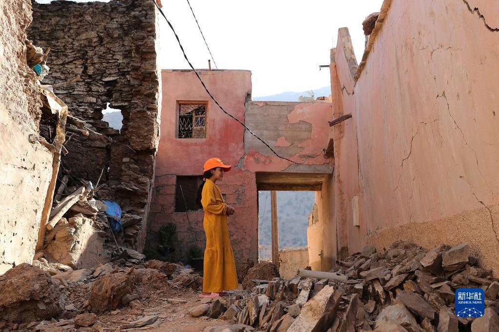 9月12日,在震中區域的摩洛哥豪茲省塔拉特恩雅庫布村,一名女孩站在地震損毀的建築旁。