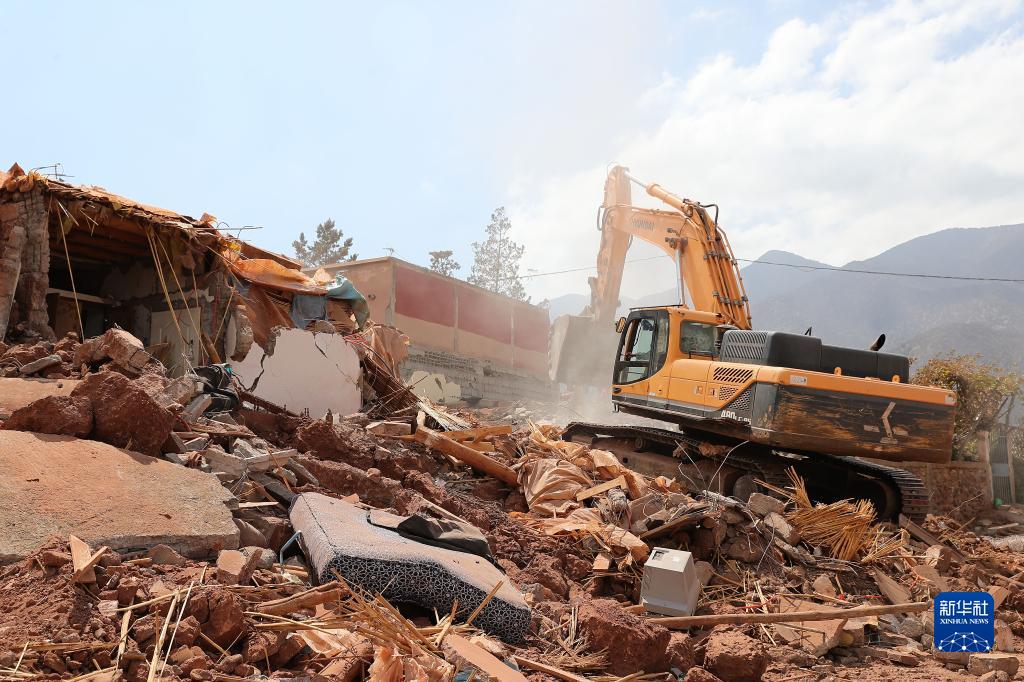 9月12日,一輛挖掘機在摩洛哥豪茲省的穆萊村清理廢墟。