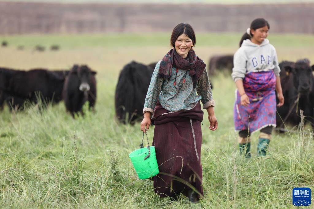8月17日,在青海省黃南藏族自治州河南蒙古族自治縣多松鄉多松村,扎西曲培的妻子鬥格吉(左)準備去擠牛奶。新華社記者 邢廣利 攝
