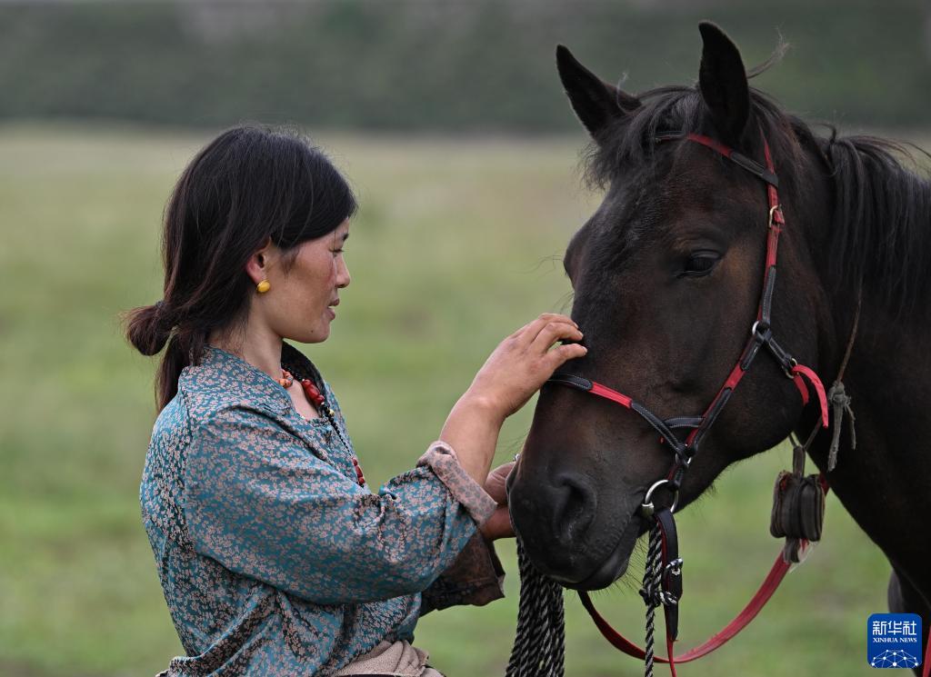 8月17日,在青海省黃南藏族自治州河南蒙古族自治縣多松鄉多松村,扎西曲培的妻子鬥格吉在照料一匹馬。新華社記者 張龍 攝