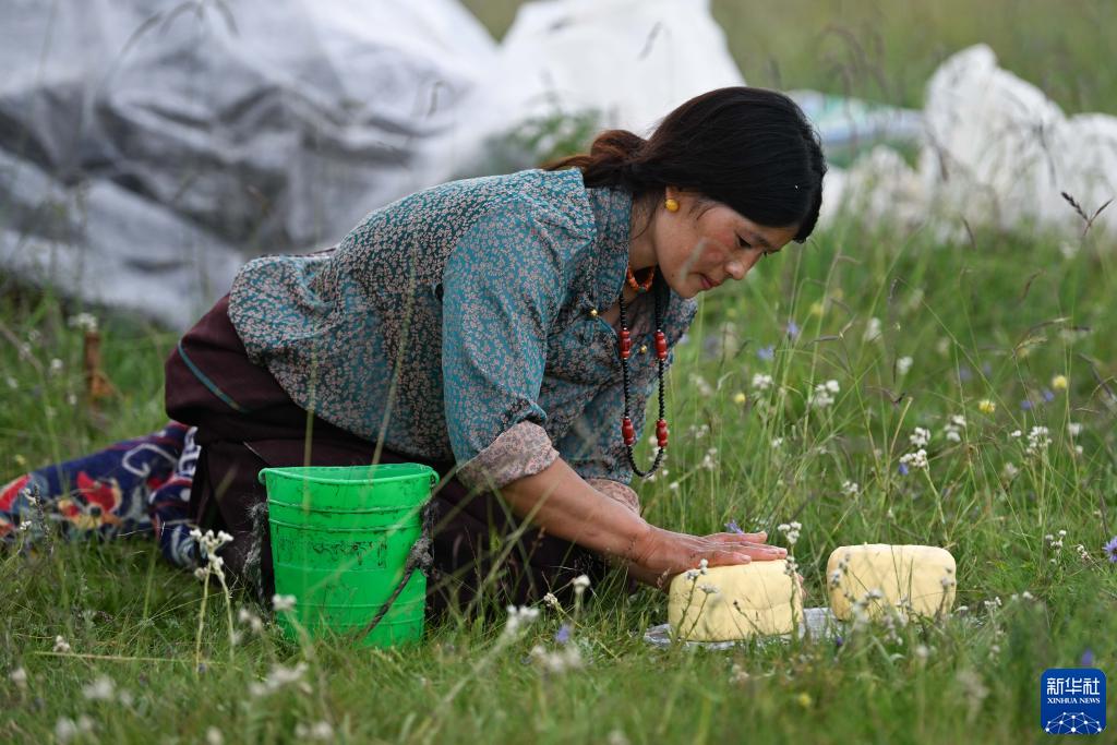 8月17日,在青海省黃南藏族自治州河南蒙古族自治縣多松鄉多松村,扎西曲培的妻子鬥格吉在製作酥油。新華社記者 張龍 攝