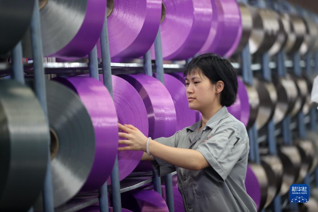 9月13日,德清縣禹越鎮一家新材料生産企業的工人在車間檢測紡織産品。