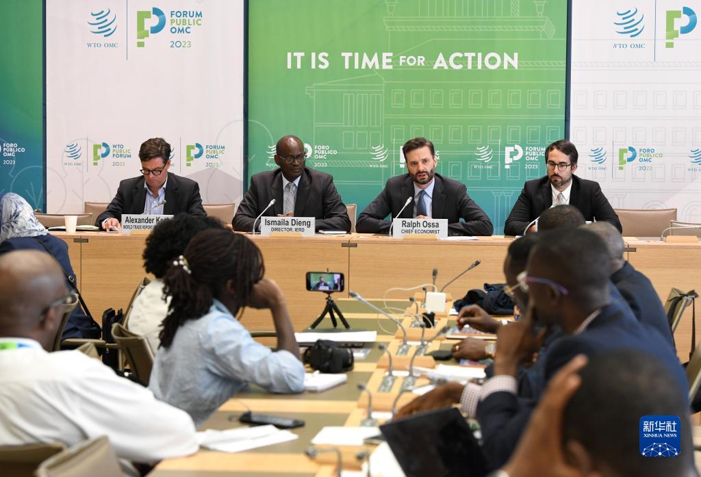 9月12日,在瑞士日內瓦世界貿易組織總部,世貿組織首席經濟學家拉爾夫·奧薩(後排右二)在《2023世界貿易報告》發布會上發言。
