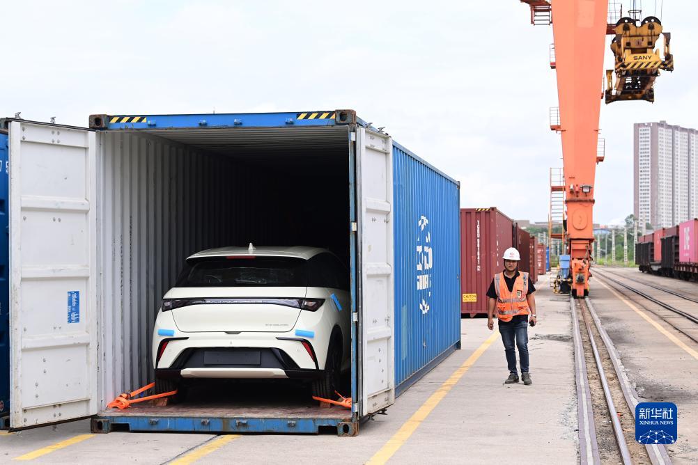 9月13日,在江西贛州國際陸港,新能源汽車已裝運至集裝箱內。