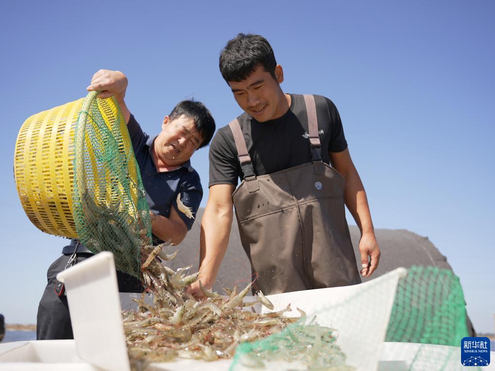 金秋時節,在河北省滄州市海興縣鹽鹼灘塗養殖池,養殖戶正忙着捕撈對蝦,一派繁忙景象。海興縣地處渤海之濱,土地鹽鹼化嚴重,種植效益差。近年來,當地依託鹽鹼灘塗搞起了特色水産規模化養殖,打造“藍色糧倉”,目前已成為海興縣主導産業之一。