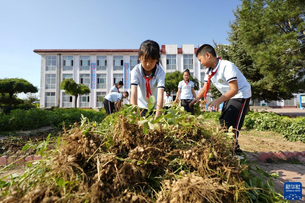 9月13日,河北省樂亭縣汀流河小學的學生在“校園農場”內收穫花生。
